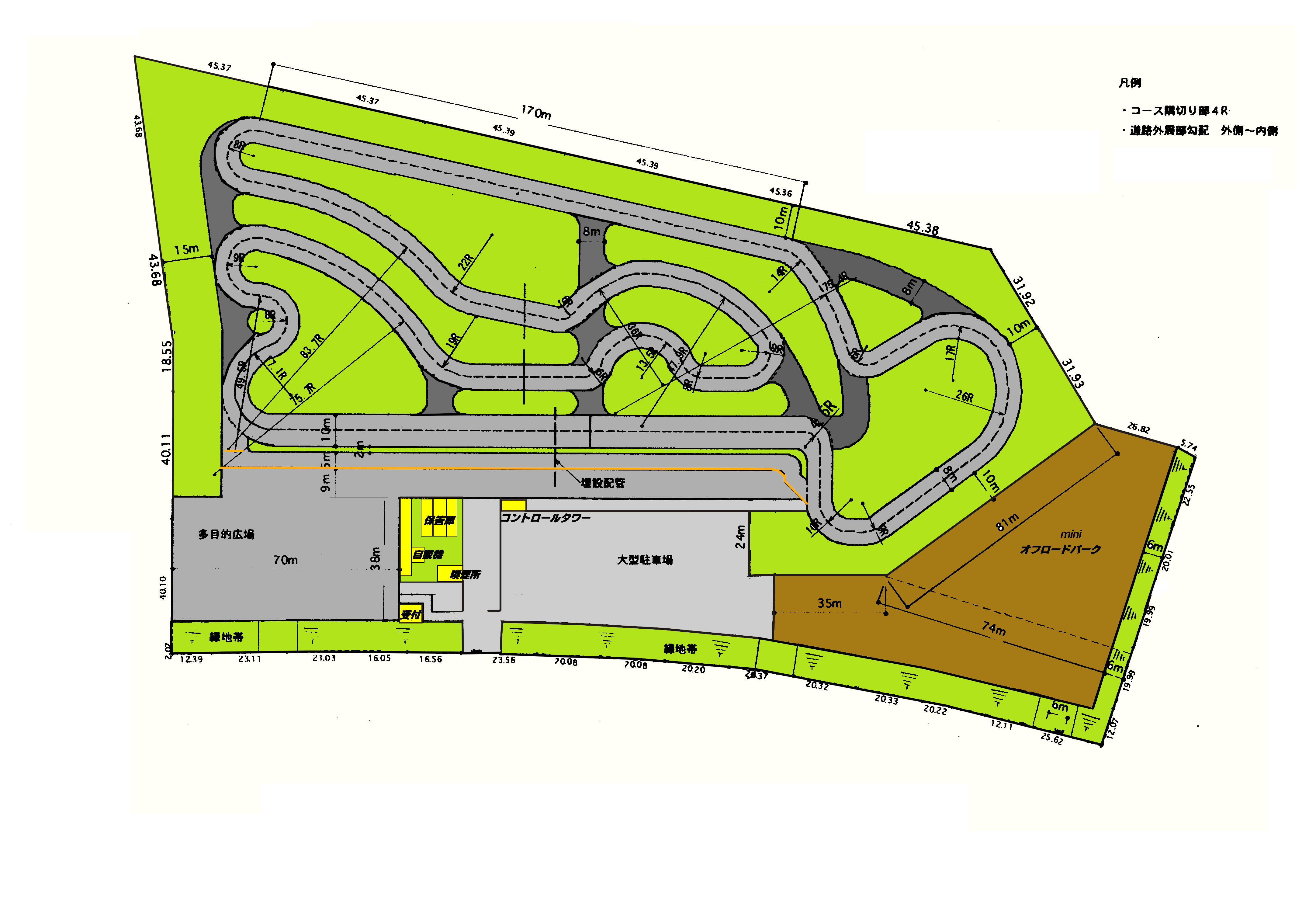 Racing コース ・・・ 1周1049mの大規模ミニサーキット。コース幅は8〜10mと初心者から上級者まで幅広く使用可能!