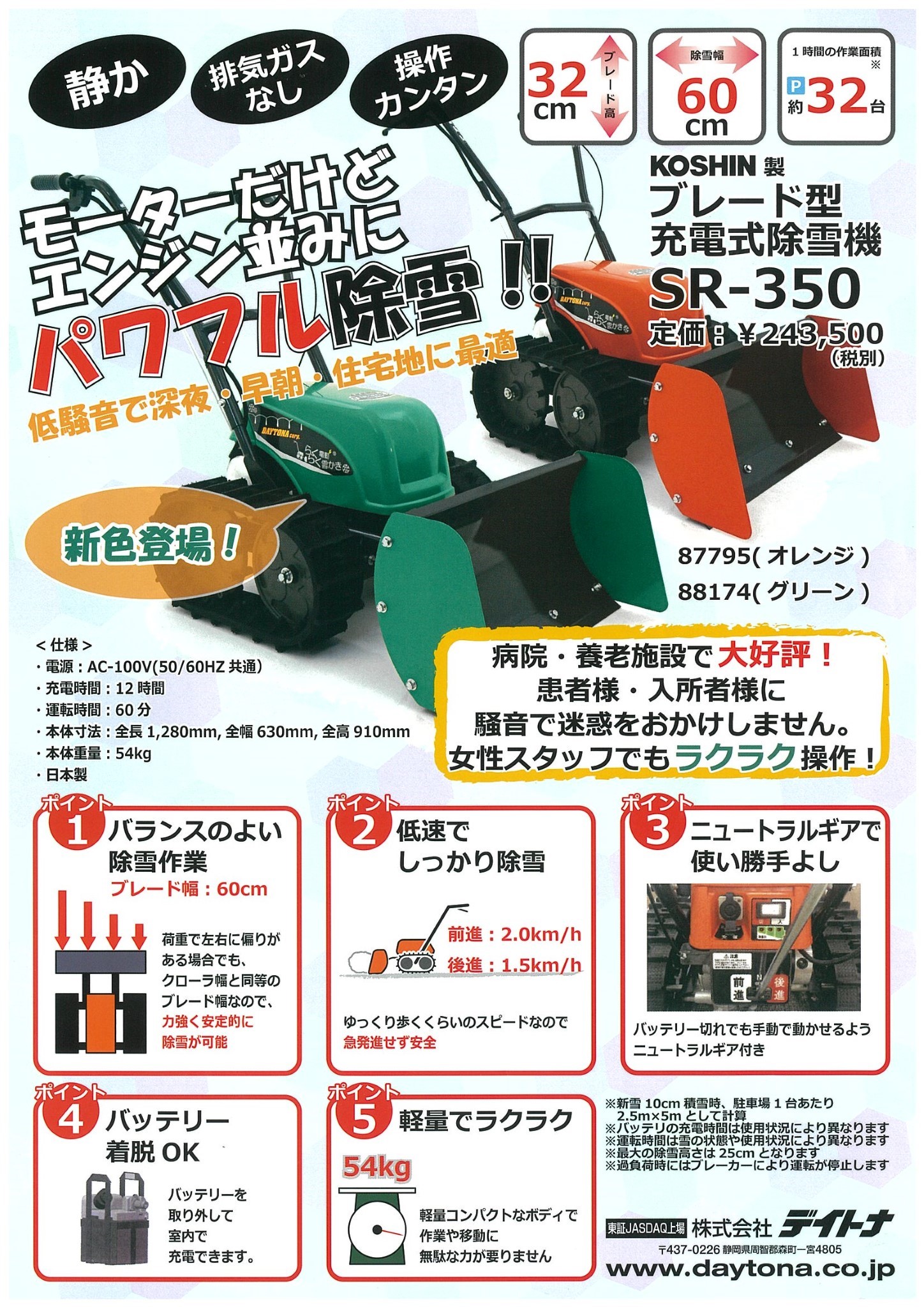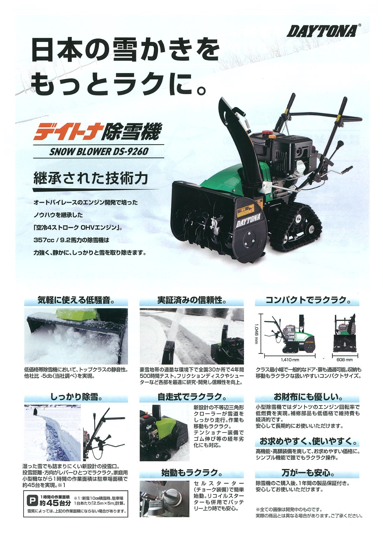 バイク用品で有名な(株)デイトナより、除雪機が登場しました。 「力強いエンジン式」「静音性に優れるモーター式」の2種類のお取り扱いがございます。 ご使用環境に合わせてお選びください。 ぜひお気軽にお問い合わせください。